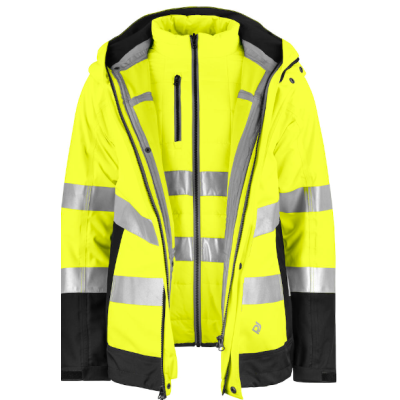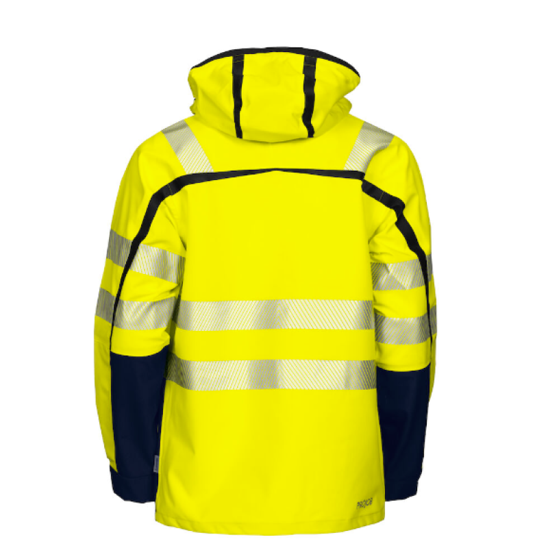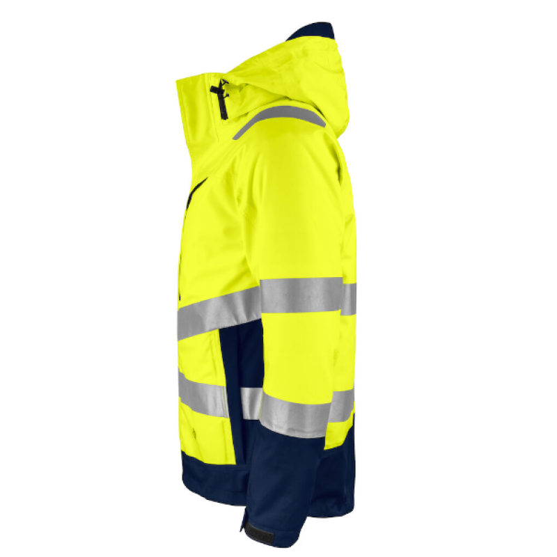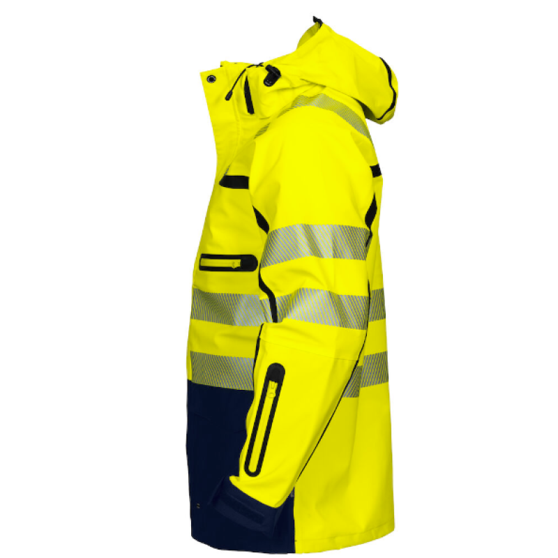 Vind- og vandtæt jakke med aftagelig inderjakke. Yderjakke med to-vejs lynlås foran med udvendig vindklap for at forhindre vindtræk og vandindtrængning. Trykknap lukning. Reflekser. Lodrette brystlommer med vandtætte lynlåse, venstre med løkke til ID-kortholder. Rummelige sidelommer, aftagelig hætte, justerbar på to måder med snøre. Justerbar talje. Justerbare manchetter med velcro også ekstra indvendige manchetter med tommelfingergreb.